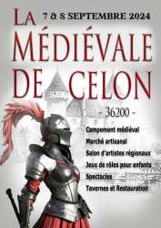 Du samedi 14 h au dimanche 19 h, deux jours d'animations dans les 4 hectares du Château de Celon (36200). 110 exposants, 5 campements de compagnies médiévales, des animations de lancer de haches, de tir à l'arc, de forge. Des groupes musicaux, des spectacles équestres et des démonstrations, des tournois de chevaliers et un spectacle de feu à 22 h le samedi soir. Restaurations sur place avec plus de 15 stands de restaurations et 3 tavernes. Entrée 5 € pour les 2 jours.